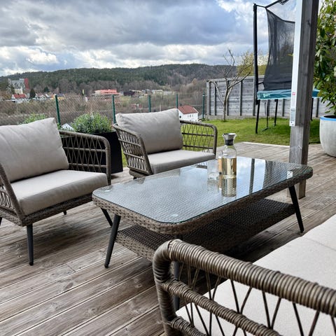 Utemøbelsett med sofa og stoler i flettet design med puter