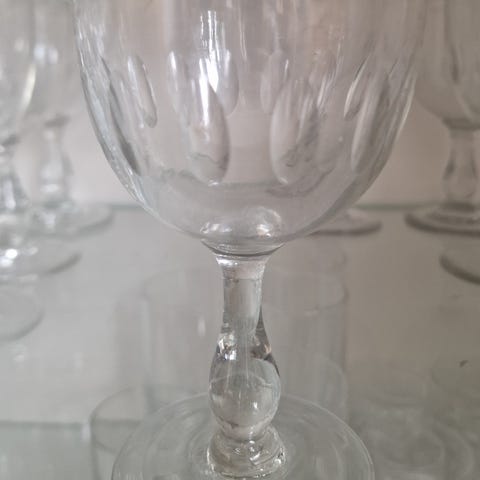Små glass. Likør? Akevitt? Dessert? 7 glass. Glassene varierer i størrelse fra ca. 7 cm til 13 cm i høyde. Materialet er klart glass. En av de fire små har et lite nagg. Ellers ikke skader på de.
