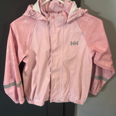 Helly Hansen barne regnjakke og bukse i størrelse 110 for jente. Produktet er lilla og laget for å beskytte mot regn og fuktighet. Jakken har hette og refleksdetaljer for økt synlighet. Passer til utendørs bruk i vått vær.