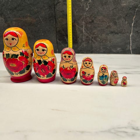 👩 👧 👦 Tradisjonelle russiske babusjka-dukker – håndmalt tre, klassiske blomsterdekorasjoner. Høyder ca 7cm. 100kr gor sett