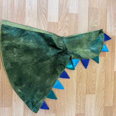 Selger et pent brukt dragekostyme. Den er one-size, men vil si den passer best for barn i alderen 2/3-5/6 år. Den er kjøpt på sprell for noen år siden og pent brukt av 2 barn. Ved nærmere ettersyn ser jeg at den ene hempen er litt løs (se bilder), men den kan sys på igjen. Ellers er det mye bruk igjen og perfekt for karnival.