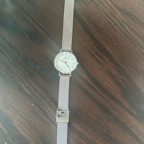 Elegant og tidløs Daniel Wellington-klokke med svart urskive og gullfarget meshreim.