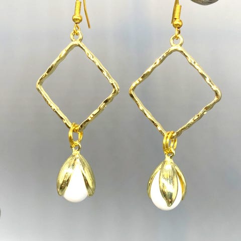 Snøklokken, vakker og modig, er ofte en av de første blomstene som bryter gjennom snøen tidlig på våren. På disse gulltonede øreringene er den delikate blomsten representert av en skinnende glassperle, kronet med naturlig rosenkvarts og labradoritt og glitrende Cubic Zirconia-krystaller.