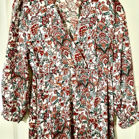 Selger en pent brukt hverdagskjole med blå og hvite striper, størrelse M. Kjolen har 3/4-lange ermer, knappelukking foran og et belte i midjen. Den har broderte blomsterdetaljer på brystet. Eegnet som en hverdagskjole. Lengde ca. 112 cm.