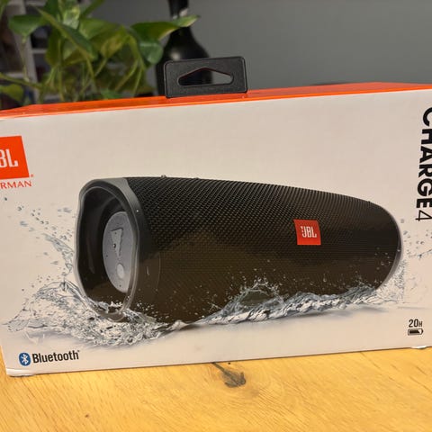 Sprutsikker, bærbar JBL Charge 2+ trådløs høyttaler som gir inntil 12 timer med musikk på én lading.