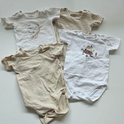 2 stykk hvite bodyer fra Hust and Claire og Reflex. Ene er omslagsbody.