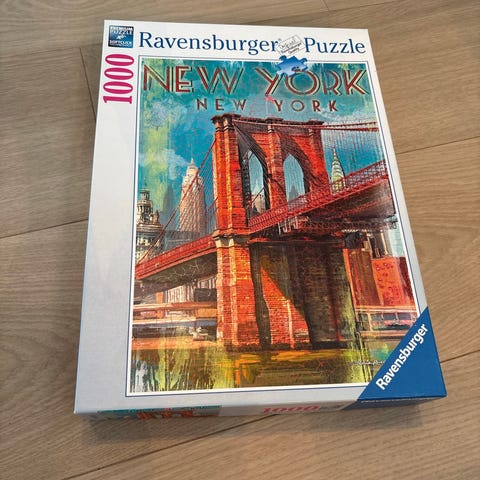 Ravensburger Panorama puslespill med 1000 biter som viser et panoramabilde av Manhatten skyline om natten.