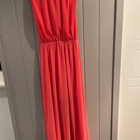Kun brukt et par ganger. Fersken/ rosa farge. Nydelig kjole som sitter pent på, den er veldig stretchy i midjen og passer de aller fleste størrelser. Lett og luftig for sommeren. Underskjørt isydd under og delvis gjennomsiktig nederst som sees på bilde. Ønsker man ikke det kan man bruke eget langt underskjørt. Det er hemper i begge sider så man kan tre et sløyfebånd eller belte rundt for å gjøre kjolen mer pyntet. Kan sendes mot frakt eller hentes i Fredrikstad.