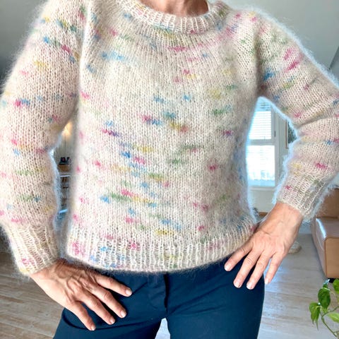 Hjemmestrikket genser i merino og mohair. V-hals og splitt i siden.