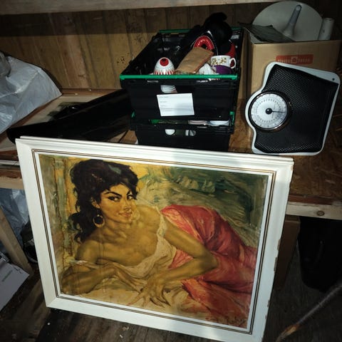 Diverse innrammede malerier, illustrasjoner og fotografier samt fat i tre og metal selges samlet eller enkeltvis.