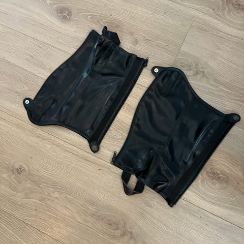 Ridechaps i svart farge. Designet for å gi beskyttelse og komfort under ridning. Har glidelås og elastiske detaljer for bedre passform.
