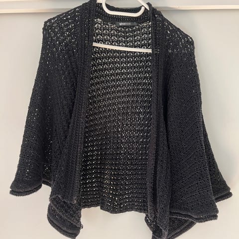 Ubrukt omslagsjakke strikket i Drops Merino Extra Fine, et mykt og varmt ullgarn som ikke klør. Jakken er litt oversized og åpen i fronten. Aldri brukt her, da den ikke passet så godt. Se bilde fra oppskriften, men jakken er strikket uten lommer.