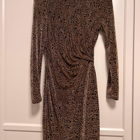 Floyd festkjole i størrelse XS, svart og gull farge med glitter. Laget for kvinner, med lange ermer og tettsittende passform. Egnet til festlige anledninger, så som julebord m.m.