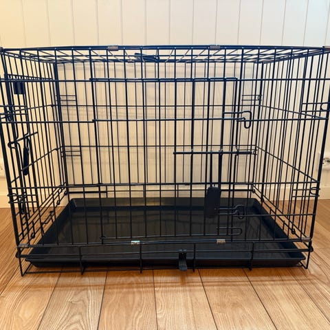 Ukjent merke hundebur laget av svart metall. Bur med gitterkonstruksjon, egnet for oppbevaring av hund. Inkluderer en plastbunnplate for enkel rengjøring. Buret er sammen leggbart for mindre plass når det ikke brukes