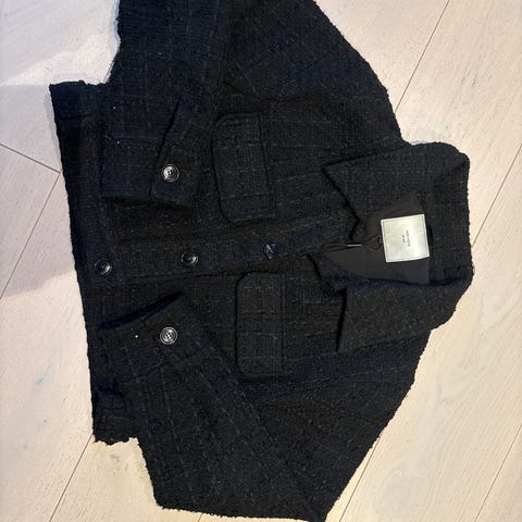 Kjempefin svart bouclet jakke med knapper og påsydde lommer i front. Str. M. Ingen bruksmerker.