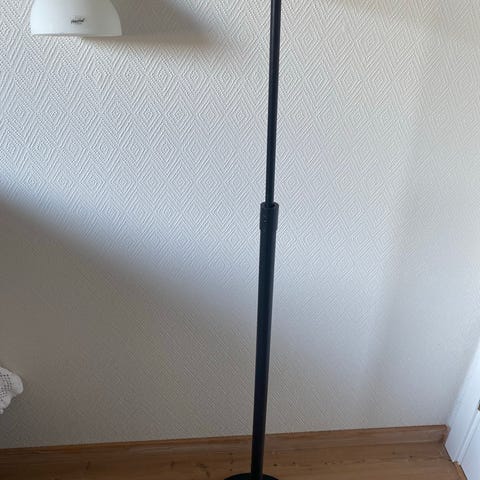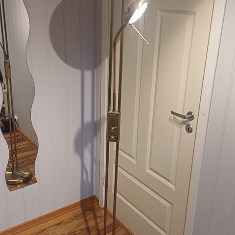 Stilig og moderne gulvlampe i messing med tre hvite glasskuler. Fremstår som ny!