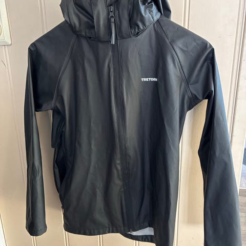 Fin regnjakke fra Tretorn i str 158/164, avtagbar hette med refleks. Jakken er lett og kan pakkes inn i lommeposen, superpraktisk. Jakken er pent brukt, jakken har gått litt opp i sømmen ca 3-4 cm nederst på den ene armen, dette gjenspeiles i prisen.