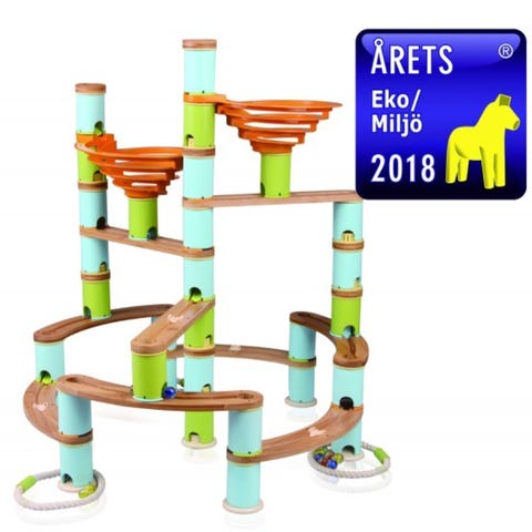 Bamboo Build & Run fra UDEAS er et sett for å bygge kulebaner laget av bærekraftig bambus og tre. Det er et morsomt pedagogisk leketøy, og er ment for barn fra 3-4 år og oppover. Settet inneholder deler som spor, trakter og broer, og kommer med en veiledning med tips og triks for bygging.