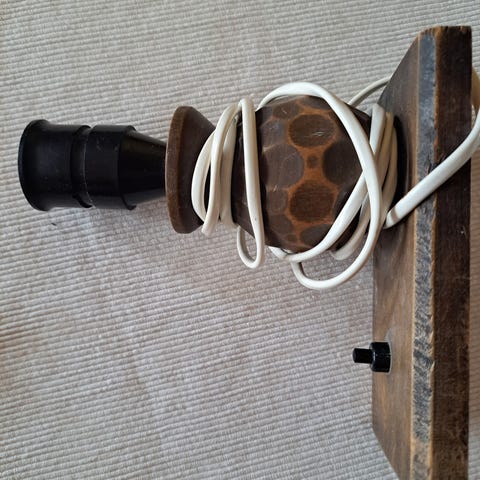 Gammelt lampe-oppheng i porselen med stor led-pære, E27.