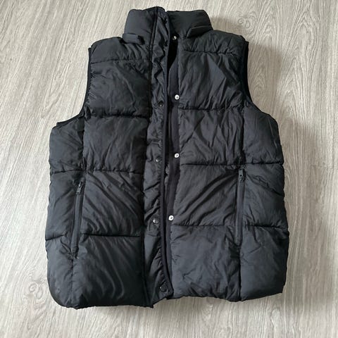 H&M XXS svart vattert vest for dame. Vesten er uten ermer og har en polstret design som gir ekstra isolasjon.🍁