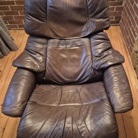 Ekornes Stressless med puff selges. Stolen har noen synlige småmerker, men er ellers fin. God å sitte i.