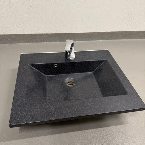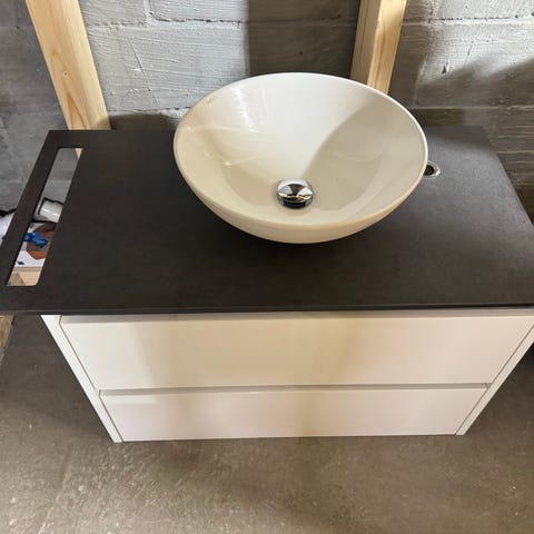 Kvalitetsinnredning til bad. Svart polery nero resolutto granitt med porselen servant. 48,5cm dyp og 99,5cm bred. 3 cm tykk. Må hentes. Ny pris 12.000