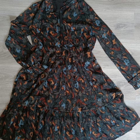 Kjolen er lett og luftig i 100% polyester, et blomsterinspirert design, lang lengde og armer. Pynte-knapper i front og fin kant runt krage. Kan pyntes opp eller ned-avhengig av tilbehør, så veldig anvendelig. Kjolen er ubrukt-jeg var nok ikke så «romantisk» av meg i stil😉