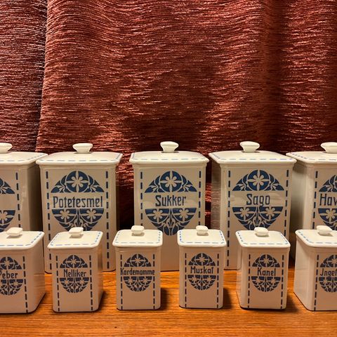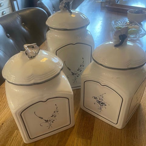 Sett med 3 små krukker til sukker/syltetøy/salt mm inkl fat vurderes solgt.