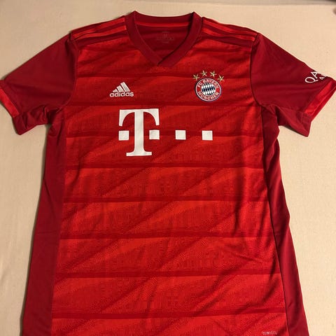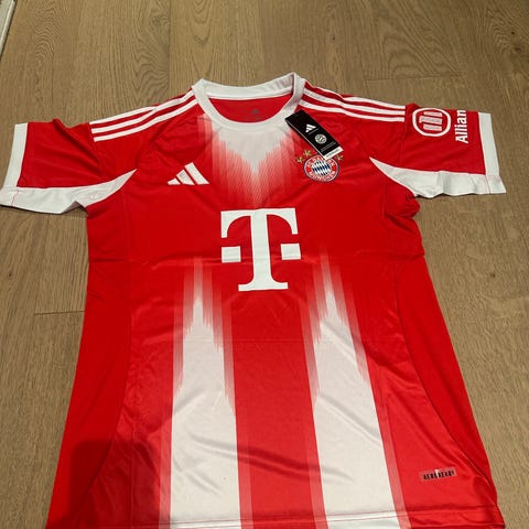 Adidas Bayern München fotballtrøye i størrelse M for menn. Trøyen er hvit med røde detaljer og laget av polyester med Climalite-teknologi som gir fukttransport. Passer til bruk ved fotball og annen sport.