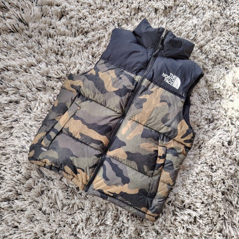 The North Face vest i størrelse M. Vesten er grå og designet for utendørsbruk. Den har glidelås foran og lommer på sidene.