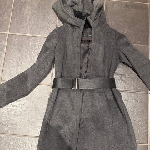Pen og anvendelig kåpe fra Zara. Kåpen er sydd med legg på ermene, som gir fin rynkeeffekt. Med lommer i front, splitt bak og satenglignende for. Har kun vært brukt ved et par anledninger, og fremstår nærmest som ny.