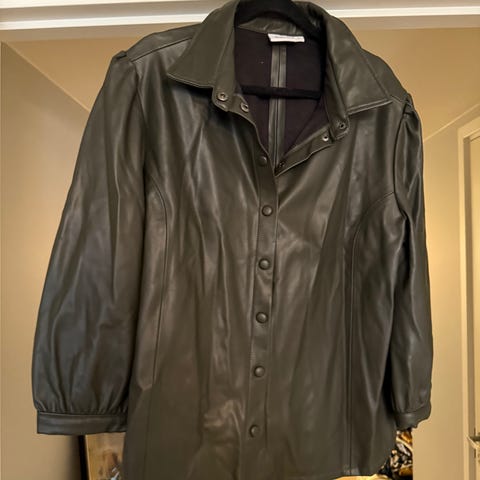 skjorte i størrelse L, grønn farge. Laget av materiale som gir en skinnlignende finish. Skjorten har lange ermer med lett puff og knappelukking foran. Passer som overdel til ulike anledninger.