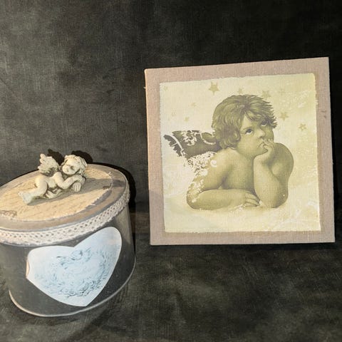 To søte, runde esker i metall med motiv av engleaktige barn fra gamledager.