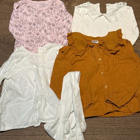 Noe lite brukt, noe mer brukt. Se anmerkning på bilde (rosa genser). Det kan i tillegg være noen svake flekker, klærne er brukt.