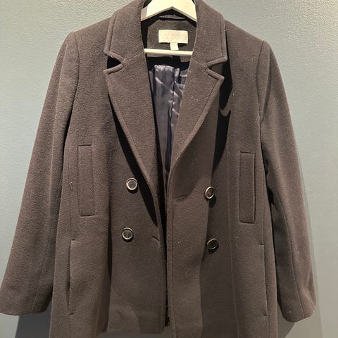 H&M kåpe for kvinner i størrelse 34. Jakken har en brun farge og dobbeltradet knappelukking. Materialet og detaljene er tilpasset for utendørs bruk som et mellomlag eller lett jakke.
