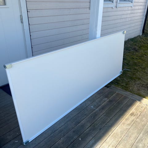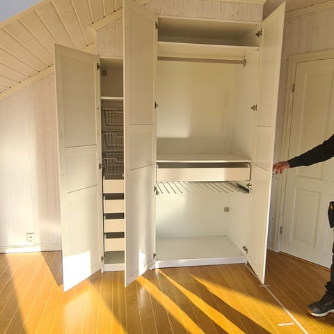 4 flotte og solide skyvedører med skinner som kan monteres med 90 graders vinkel (som på bildet).