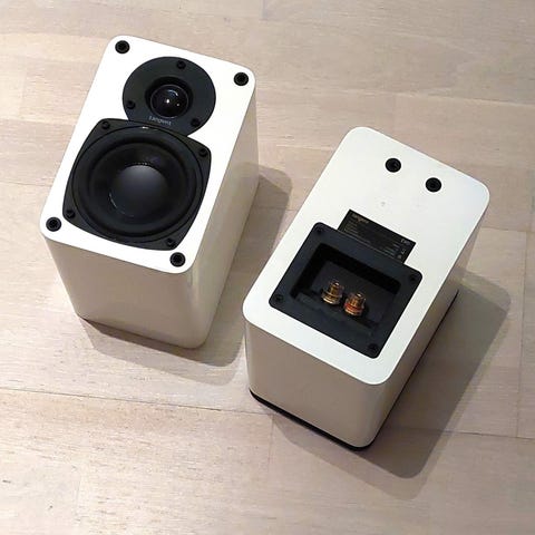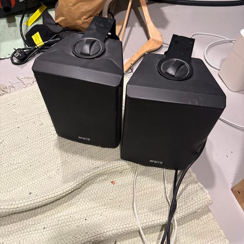 Solide bokhyllehøyttalere med god lyd. Det er litt skraper i lakken, men dette synes ikke på avstand. Kan kobles til på flere måter (se bilde av baksiden).