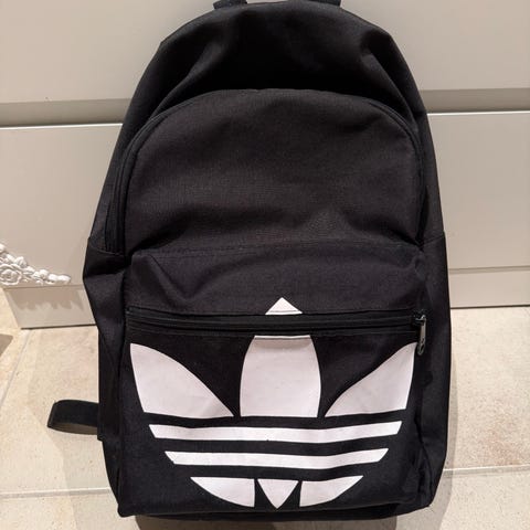 Den er stor, ca 45 x 28 cm, så passer fint som skoleveske, plass til både pc og noen bøker. Glidelås lukking.