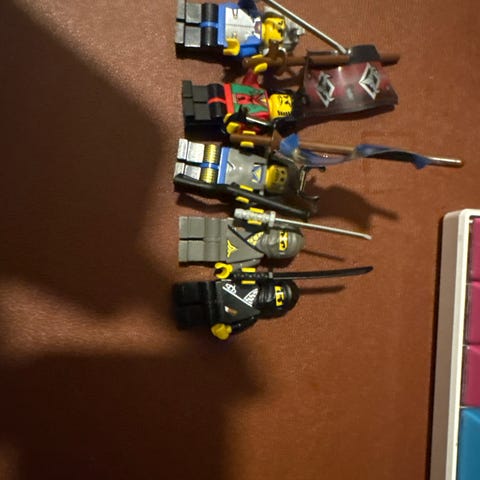 LEGO NINJAGO minifigurer med tilbehør inkludert skjold, hjelm og våpen i gullfarge. Passer som samleobjekt.