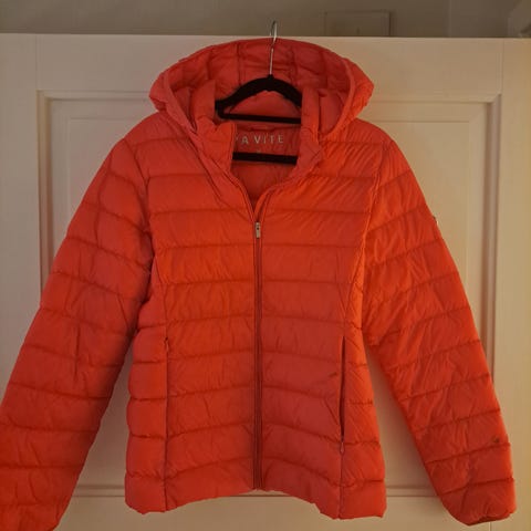 Lett og myk dunjakke i 90% dun og 10% fjær fra La Vite, kjøpt på Match. Farge er lys rosa/beige aktig.