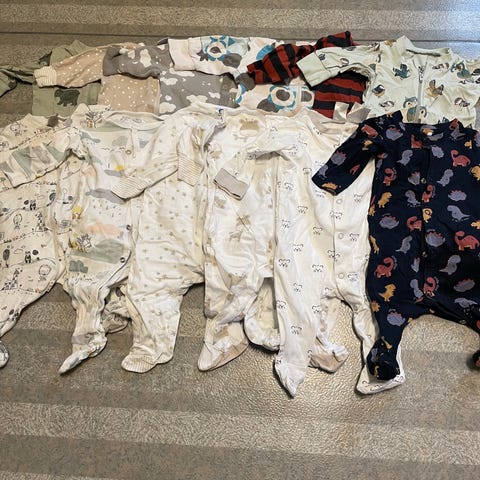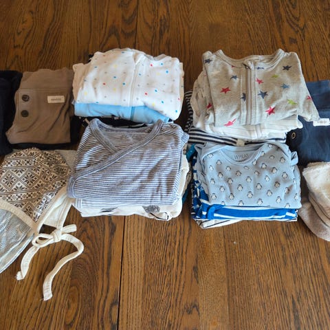 Klespakke med ca 50 plagg (+ sokker, gulpekluter og luer), hovedsakelig i størrelse 56. Jeg tror det kun er én bukse i størrelse 50.