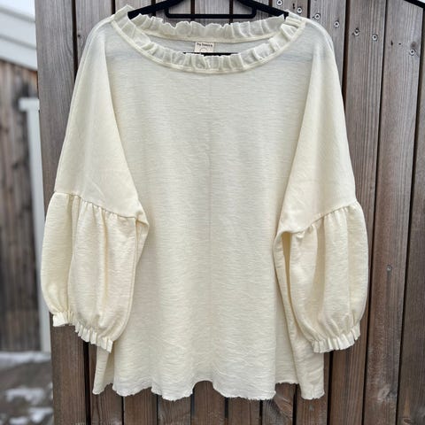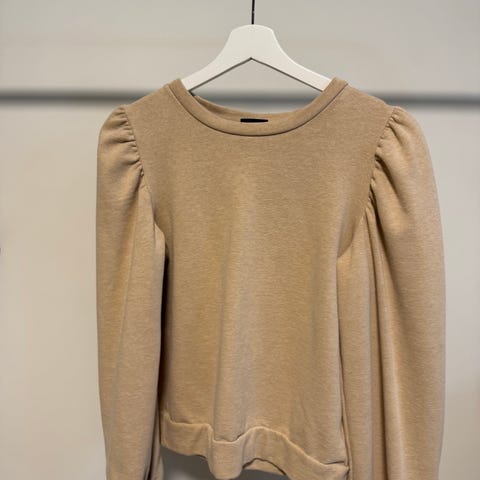 Selected Femme genser i beige farge, størrelse 42 for kvinner. Genseren har en enkel rund hals og ballongermer som gir et feminint uttrykk. Materialet er mykt og behagelig, egnet for daglig bruk.