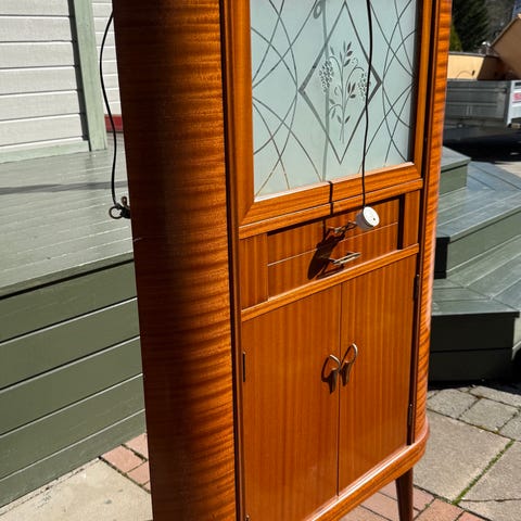 Et tidstypisk skap med vakre detaljer som frostet glass med mønster og messingbeslag, perfekt for deg som har en forkjærlighet for retro, ekte dansk design og håndverk.