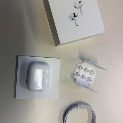 Apple AirPods Headset trådløs med hvit farge. Inkluderer ladeetui, ladekabel, og brukerveiledning. Designet for trådløs lydavspilling og handsfree bruk. Fra 2023, tatt i bruk september 2024.