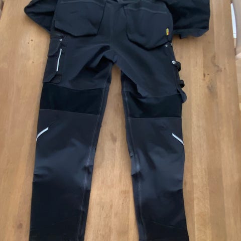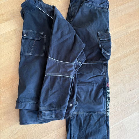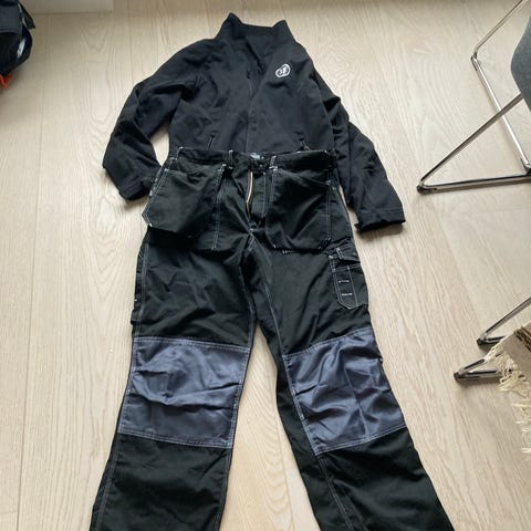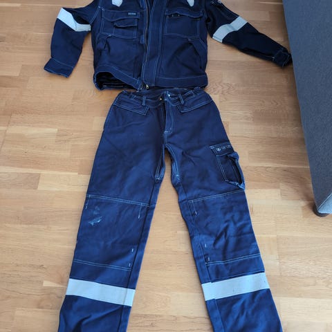 Kjøpt, vasket og etter det aldri brukt. Arbeidsklær for yrkesfag, arbeidsliv. Bukse og jakke.