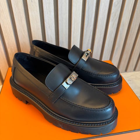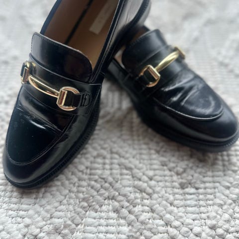 H&M Loafers i størrelse 39, svart farge. Skoene har dekorative metallspenner på oversiden og en solid gummisåle. Passer for daglig bruk og ulike anledninger. Knapt nok brukt