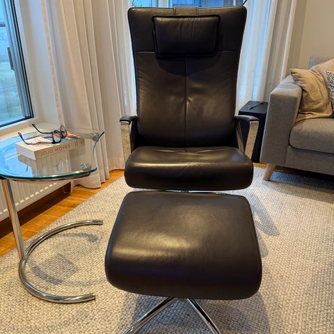 Lenestol i skinn med tilhørende fotskammel til salgs. God sittekomfort og pent brukt. Kjøpt på Bohus for noen år siden.