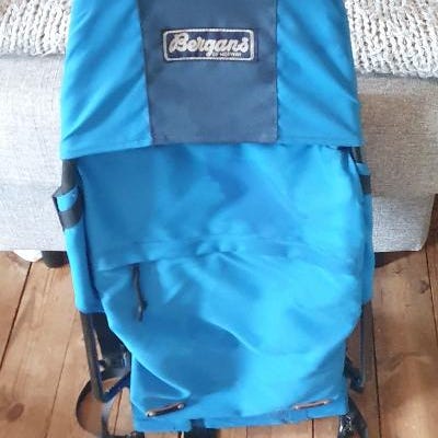 Bergans ryggsekkbæresele laget av stoff i blå farge. Designet for unisex bruk. Utstyrt med justerbare stropper og polstret rygg for komfort ved bæring av barn eller utstyr. Egnet for friluftsliv og turbruk.
