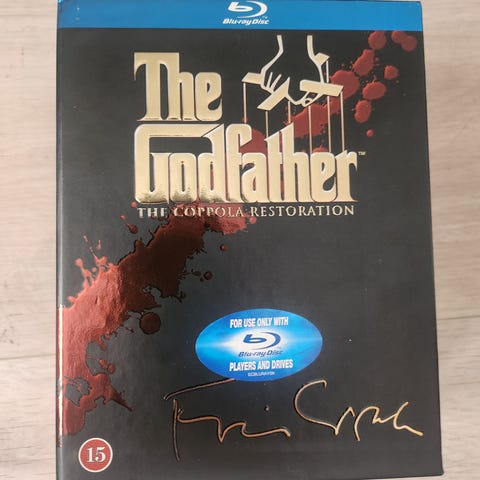 The Godfather The Coppola Restoration DVD Box Set inneholder den kjente trilogien med restaurert bilde og lyd. Pakken inkluderer tre DVD-er med filmer og over 4 timer med ekstra materiale. Filmenes originalversjoner er presentert slik regissøren Francis Ford Coppola opprinnelig hadde tenkt. DVD-settet har norsk tekst og er egnet for samlere og filminteresserte.