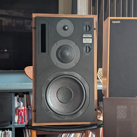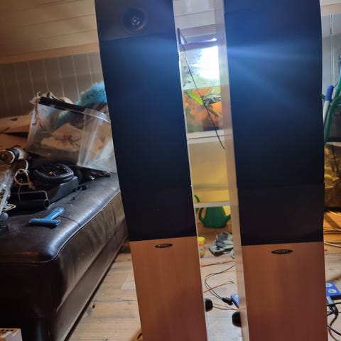 2 stk. "DanSpeak gulvhøyttalere type Alexander med fyldig og god lyd. Høyttalerene måler 105 cm i høyde. Er 2-delt med egen bass.del og diskant-del. Kassene er i flott teakfinish. Bassdelen er 73 cm høy og 40 cm dyp. Diskantdelen 32 cm høy og 30 cm. dyp. Høyttalerene står på "spikes" for minimal resonanse til underlag. Elementenes diameter: Bass i egen basskasse, mellomtone 15 cm. og diskant 10 cm. Et høyttalersystem å bli glad i!